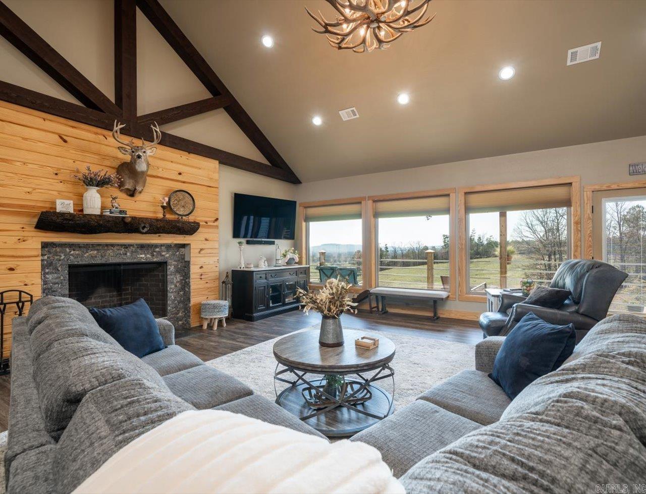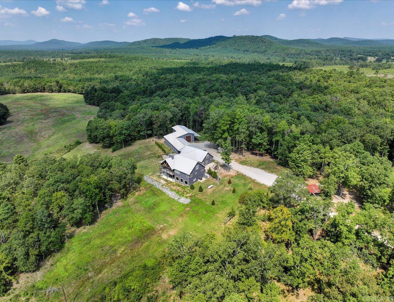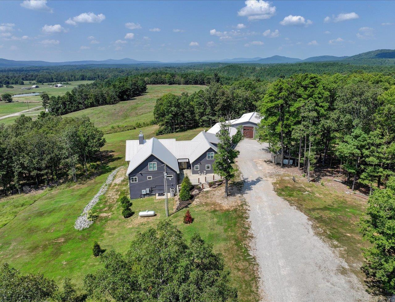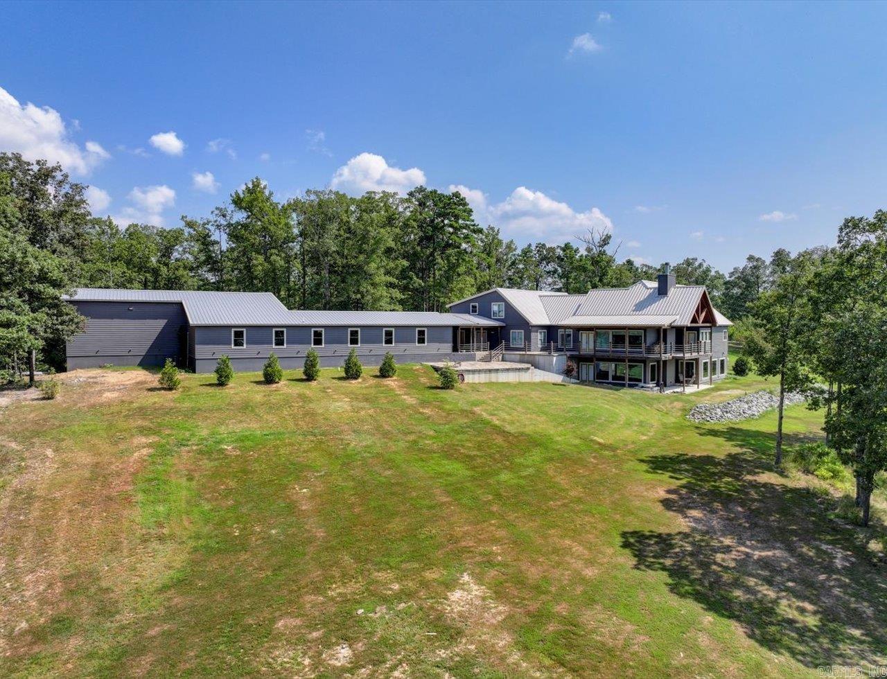 Experience beautiful views and stunning sunsets from the deck or stone patio of this spectacular custom-built home, set on 23+ acres in the Lake Hamilton School District. This impressive 4-bedroom, 4.5-bath home spans approximately 6,079 square feet and is built for both luxury and security with 12" concrete walls, two master suites on the main level, two laundry rooms, and a safe room. Entertain in style with a massive game room, and enjoy the convenience of a 3-car garage, an RV garage totaling approximately 2,761 square feet, and an 894-square-foot heated/cooled workshop. A whole house generator ensures you're always prepared. Located just a 30-minute drive from Oaklawn Racetrack and Lake Ouachita, this property truly has it all. This is the dream home you've been waiting for! Agents - Call Showing service to schedule all showings.