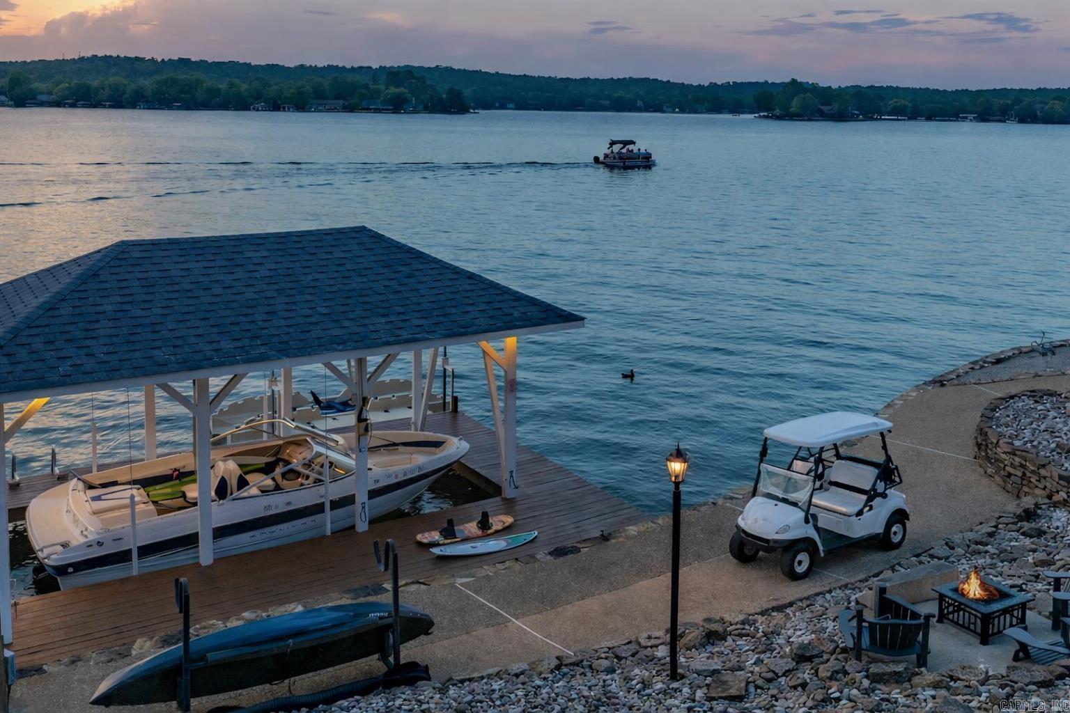 Experience lakefront luxury in Hot Springs Village with this fully furnished executive retreat on Lake Balboa, a 944-acre recreational lake. Positioned on a private .56-acre cul-de-sac lot with level circular drive, this polished two-level home offers 3,630 sq ft, 4 bedrooms, and 3.5 baths with three en-suites—ideal for luxury living, second home, or investment property. Fresh modern design showcases engineered wood flooring, dual electric fireplaces, and walls of windows in the Arkansas Room/office capturing serene water views. The well-appointed layout flows seamlessly to three expansive deck areas for elevated indoor-outdoor living. Enjoy peace of mind with a Generac® generator, smart lighting, smart locks, and security cameras. Outdoor features include a covered boat dock, kayak launch, boat, two kayaks, and Hobie paddleboard convey, offering immediate lake enjoyment. The oversized garage with breezeway accommodates 2 cars plus golf cart/workshop with attic storage. Located in a premier gated golf and lake community with 11 lakes, 9 golf courses, marina, pickleball, trails, dining, and more. A rare turnkey lakefront opportunity.