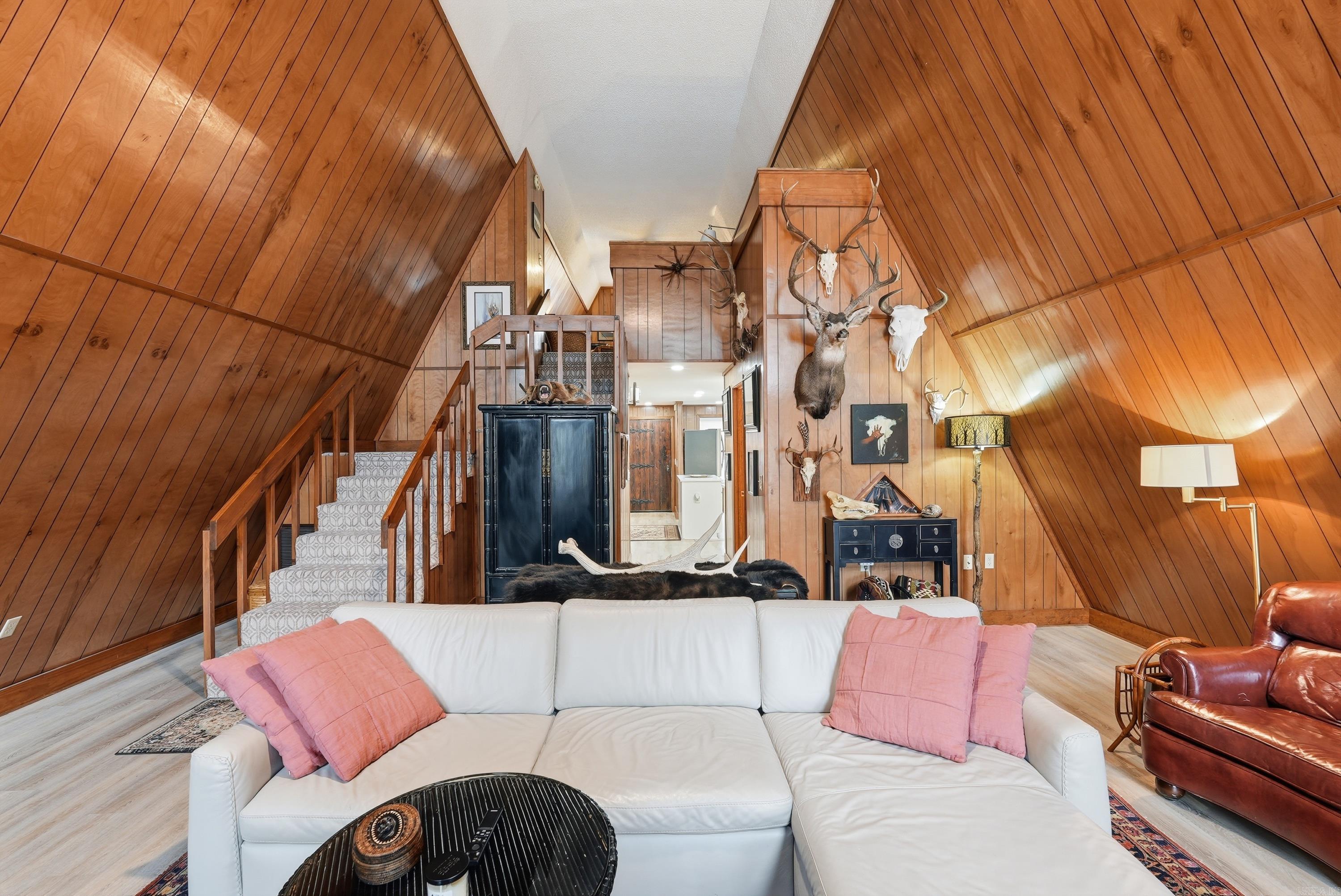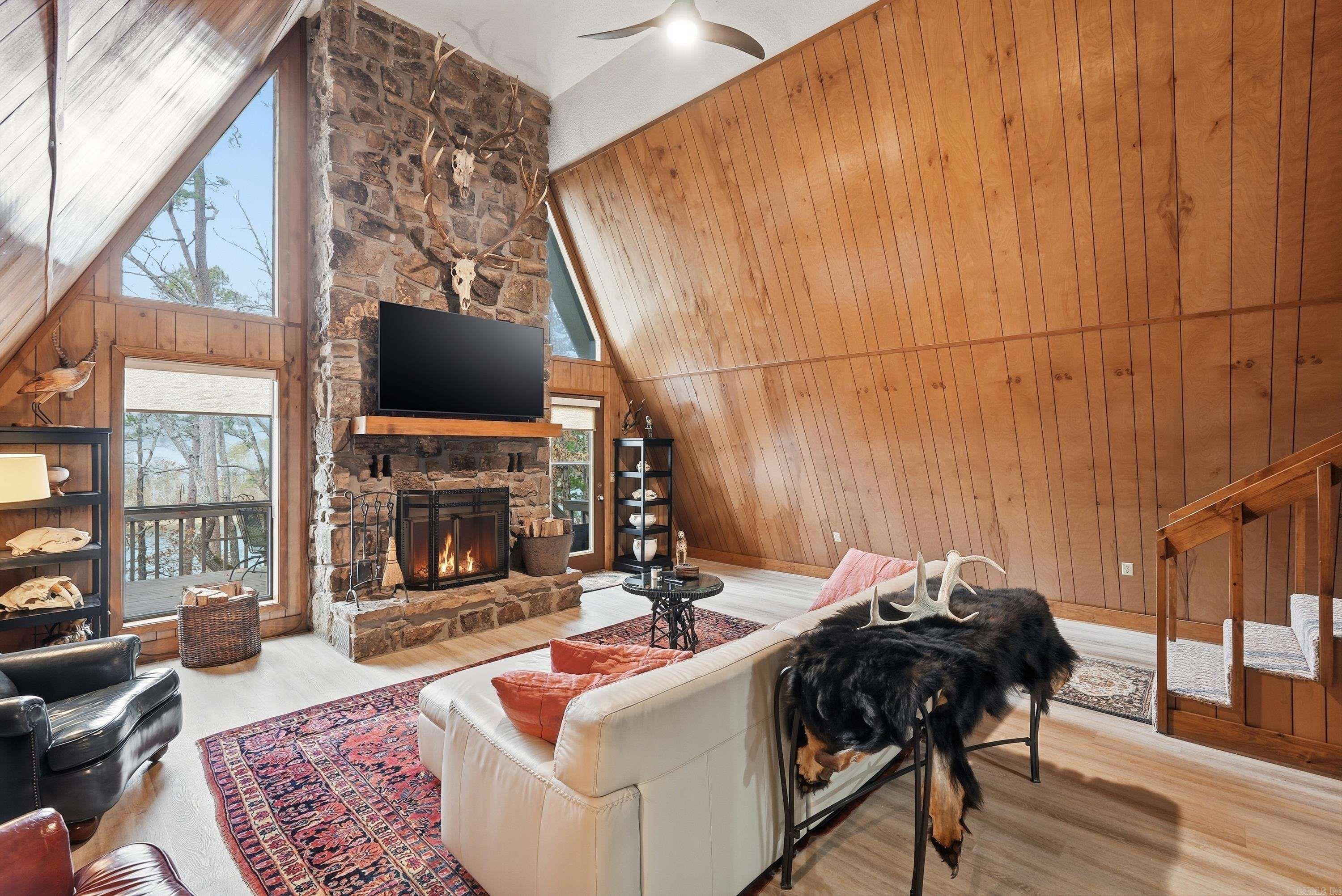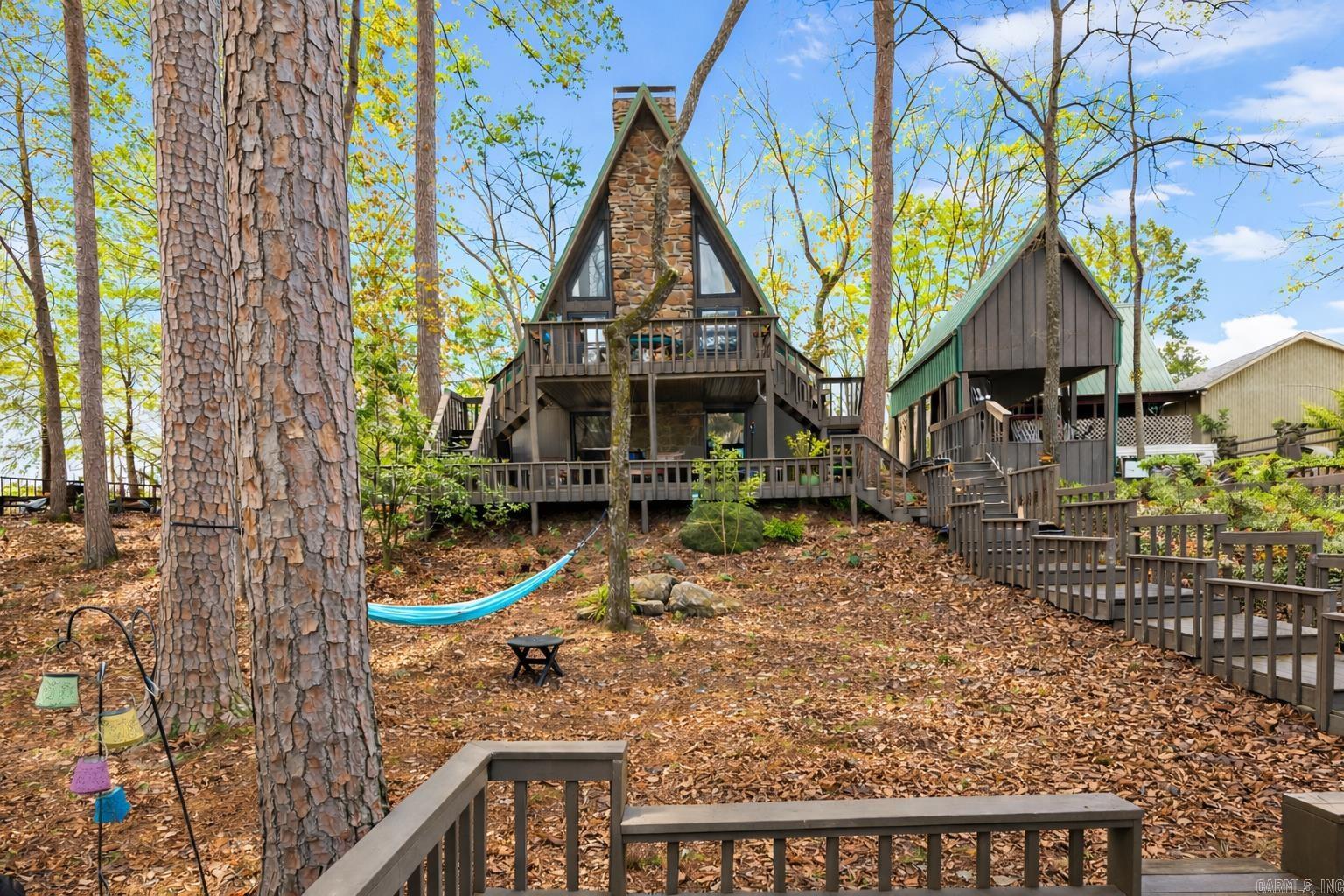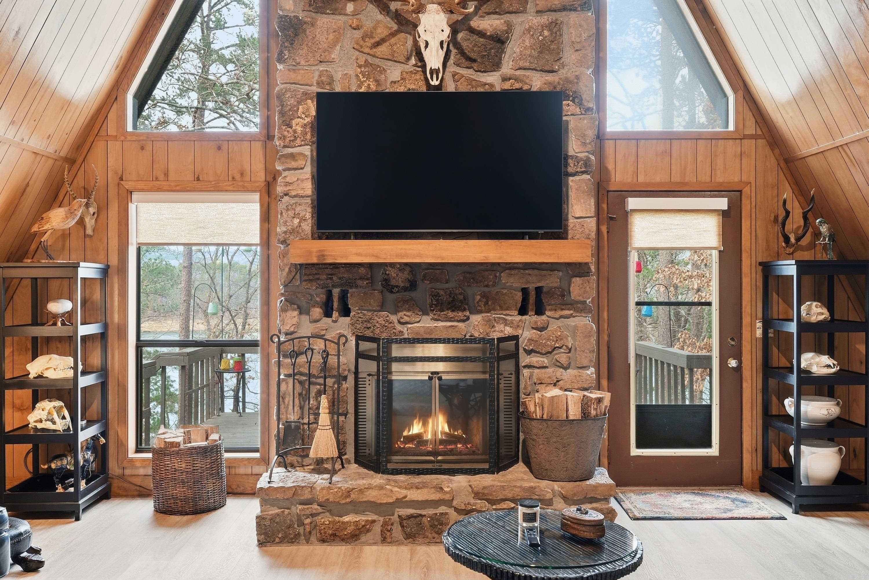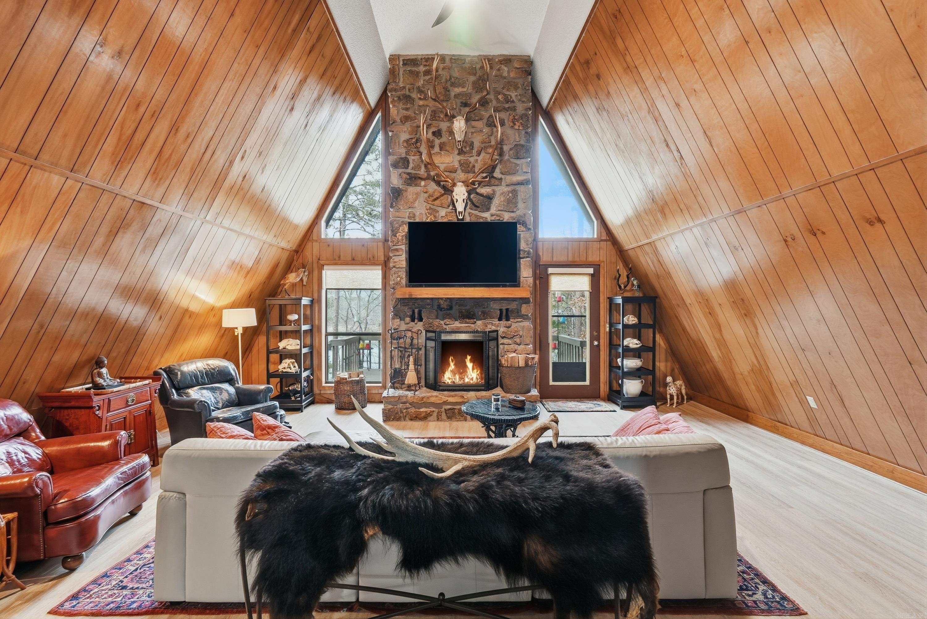When you think "Lake-House", A-Frames are a nostalgic design that comes to mind.This A-Frame is so cozy, has a wood burning fireplace, LAKEFRONT (with White Line in the water, so more trees can be cut to open the view up even more), Lake Views from the cabin & decks, plus steps down to the water. For many years the cabin has been setup to be used as a 3 bedroom (1 Bedroom upstairs above the kitchen w/full bathroom on main level, Primary bedroom downstairs w/a full bathroom & laundry room connected, & 3rd bedroom setup downstairs as well w/walk-out basement onto the lower patio. There is a large room above carport that would make a great Bunkroom/gameroom/craftroom/guest quarters,etc. The home was built in 1988, but Remodeled w/all new LVP flooring throughout the home around 2021,new roof/gutters in 2018,pull blinds installed May 2024,all new kitchen appliances, countertops & cabinets in July 2024, & High-Speed Internet through "Connect 2 First". Community Boat Ramp & Private Airstrip for property owners in "Skypoint Estates". Option to purchase extra lot across the street for additional $15,000 (Lot 18). See Virtual Tour Website to view videos, Floorplans, & see docs attached.