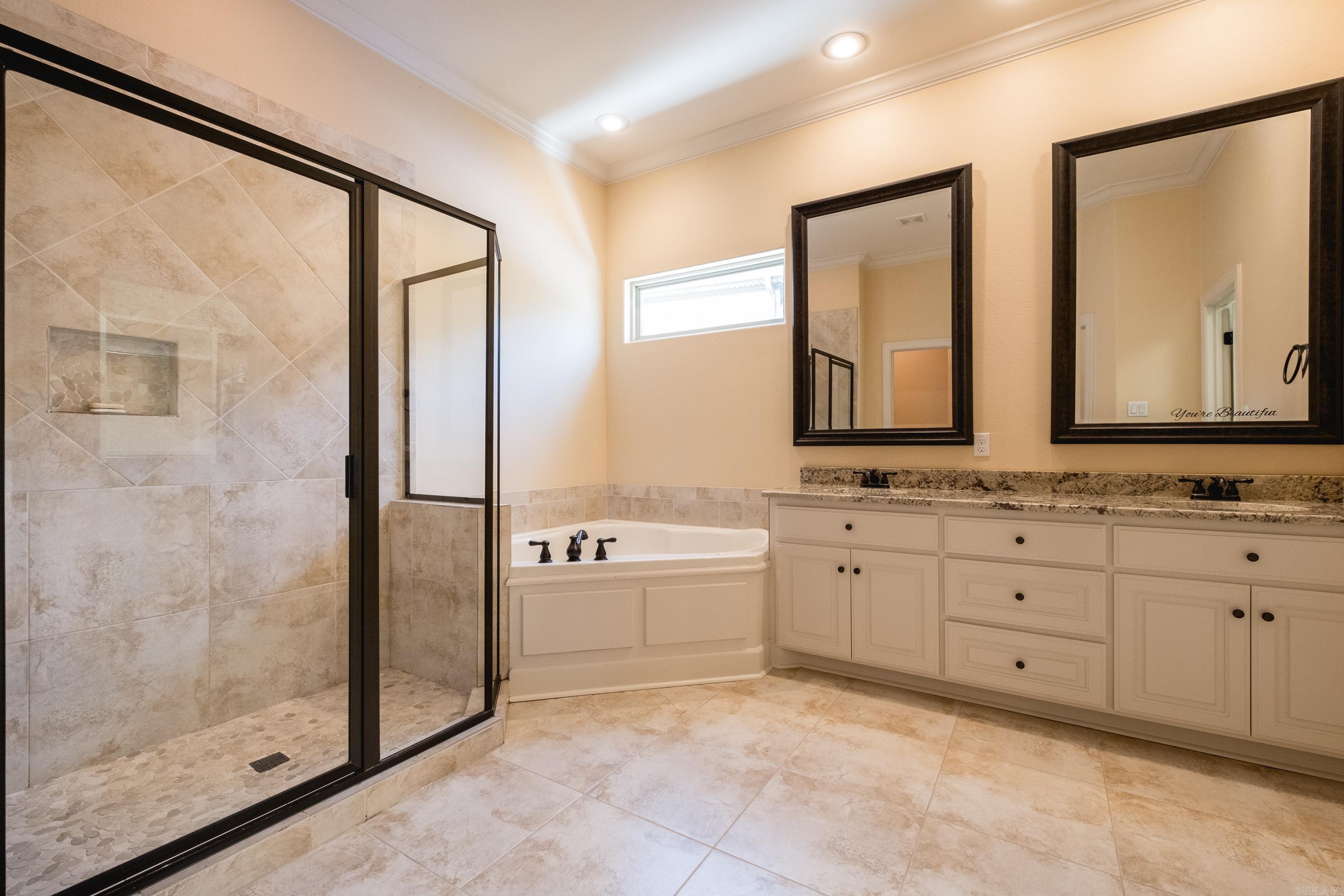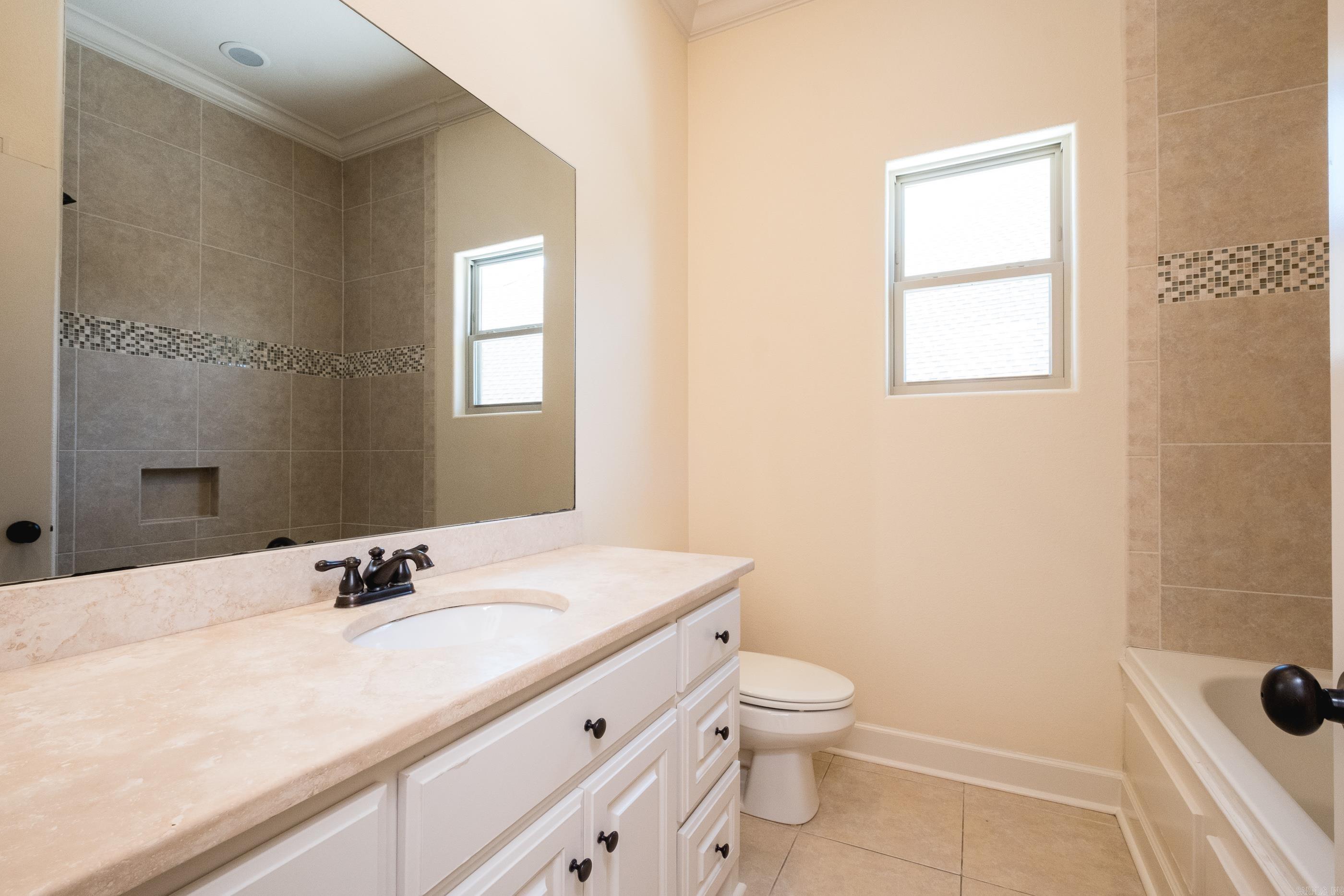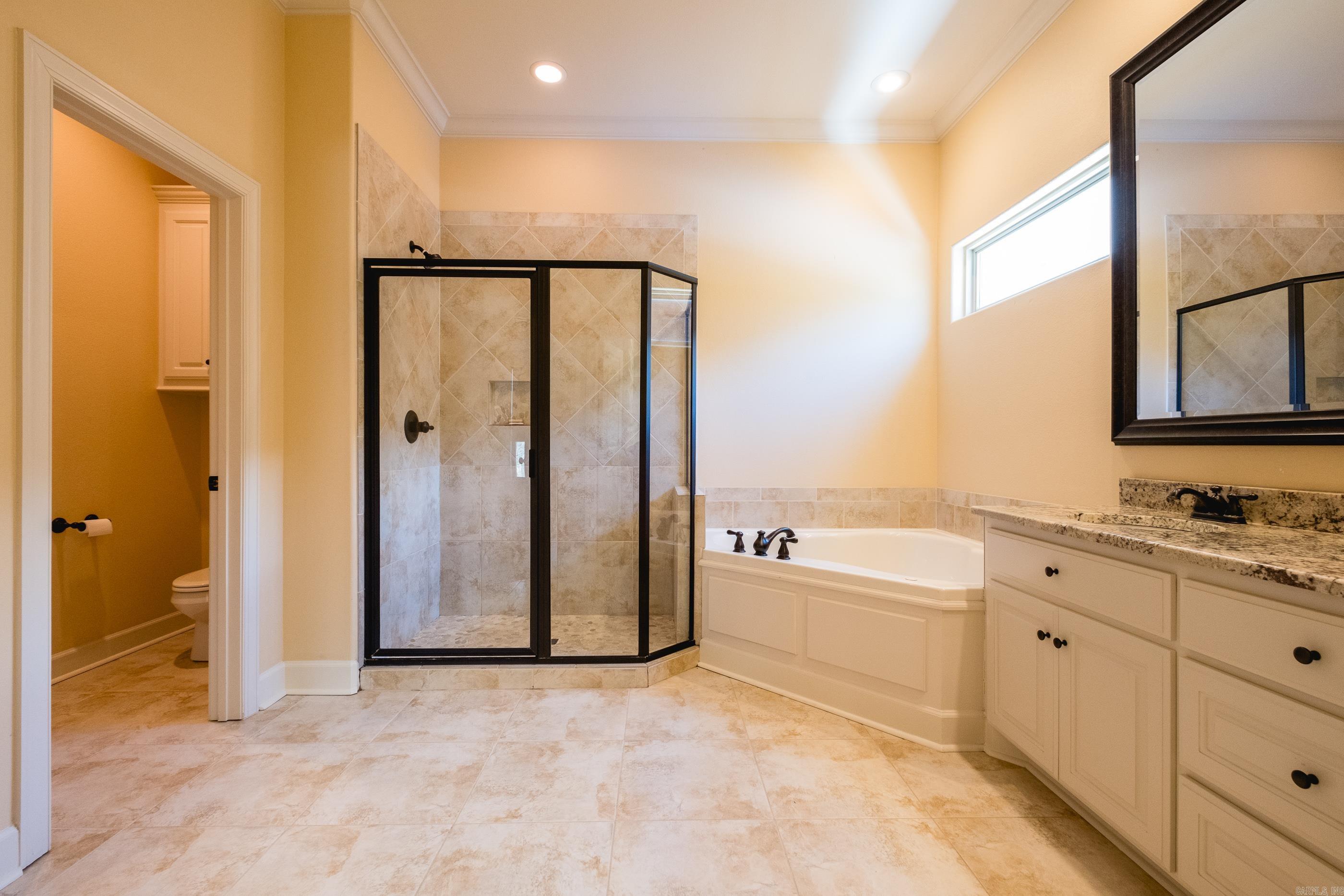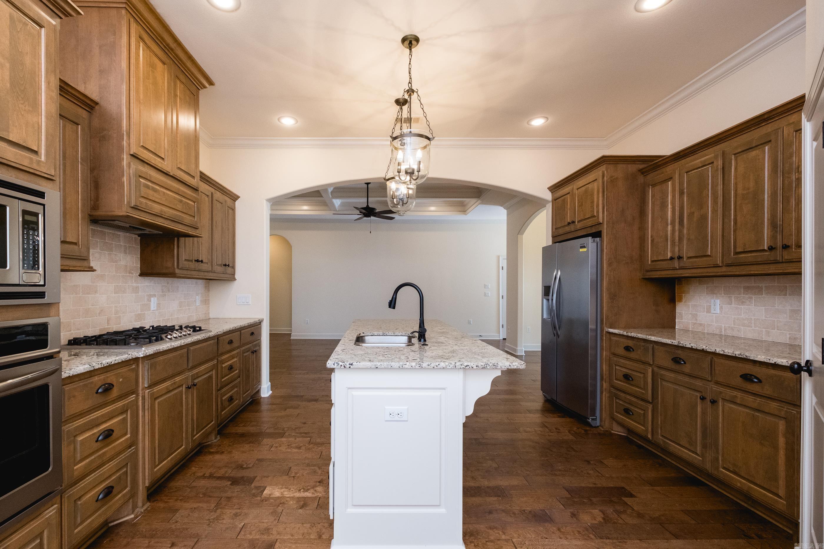Beautifully appointed single-level home where the family room showcases elegant, coffered ceilings and opens seamlessly to the dining room and eat-in kitchen, complete with a granite-topped bar and rich, dark-stained cabinetry. This home has 9' ceilings throughout, for an open and airy feel, enhanced by abundant natural light and well-placed windows. There are 4 bedrooms, with a spacious primary suite thoughtfully separated from the additional bedrooms for added privacy. A partially floored walk-in attic offers excellent storage and the potential to be finished into an additional room. Enjoy peaceful mornings on the screened-in back porch overlooking the green space beyond—an ideal spot for coffee or quiet relaxation. Located just 5 minutes from Chenal Country Club, The Promenade, and Wildwood Park for the Arts.